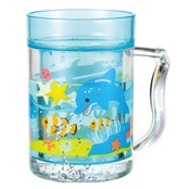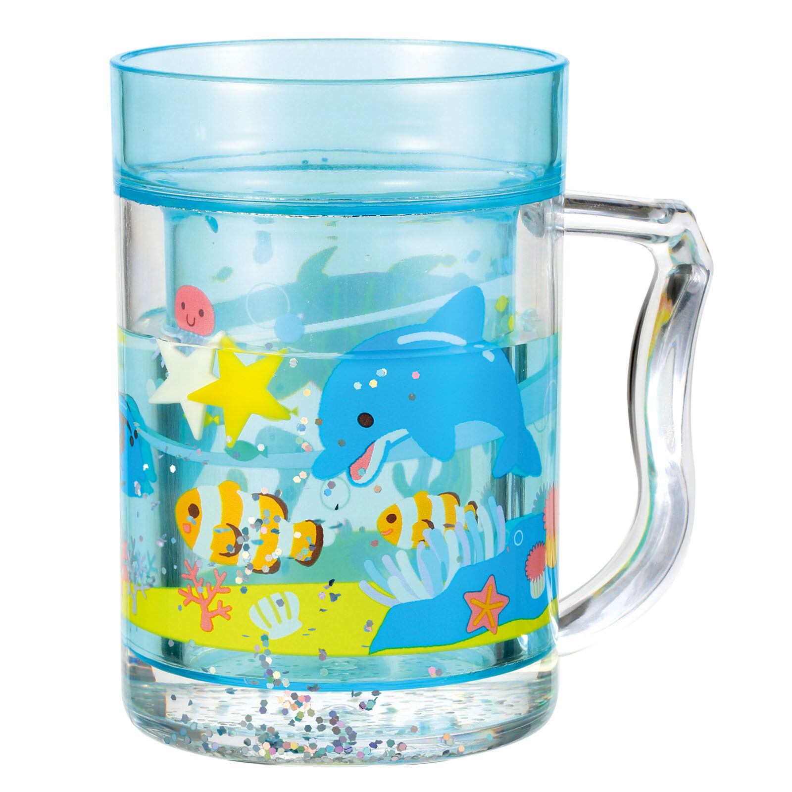 楽しい海の世界を感じる「ぷかぷかアクアコップ」は、熱帯の海をイメージしたクリアブルーの2重構造で、外側には水が入り、ヒトデがぷかぷか浮かびながらキラキラとラメが輝いているマグカップです。
