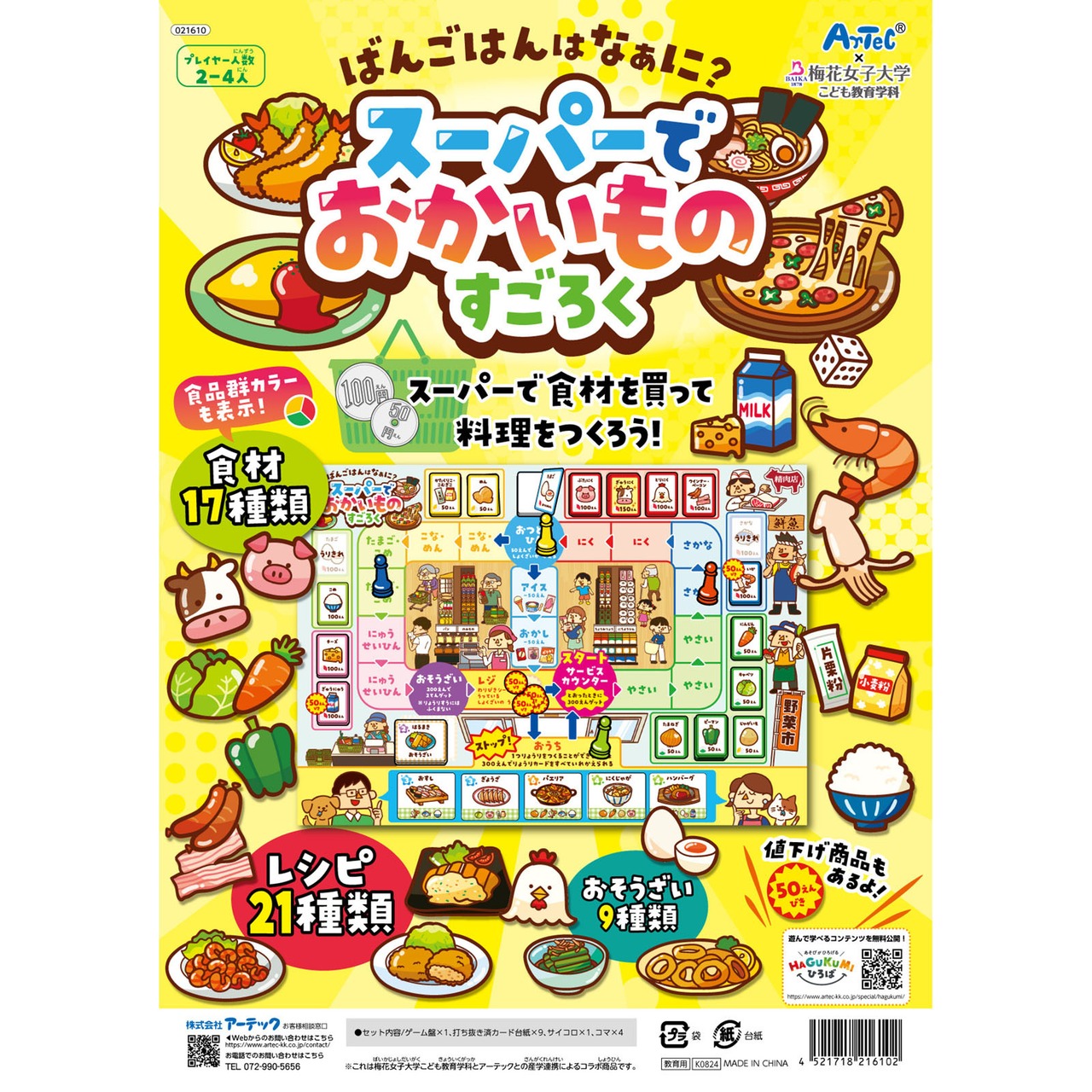 お金を払って食材を入手し、料理を完成させるすごろくで楽しさが満載です。3色食品群に基づいて色分けされた食材は、遊びながら食育にも最適です。お金払って、商品とおつりをもらう練習もできます。梅花女子大学こども教育学科と株式会社アーテックとの産学連携によるコラボ商品です。家族や友達と一緒に、楽しい時間を過ごしましょう!