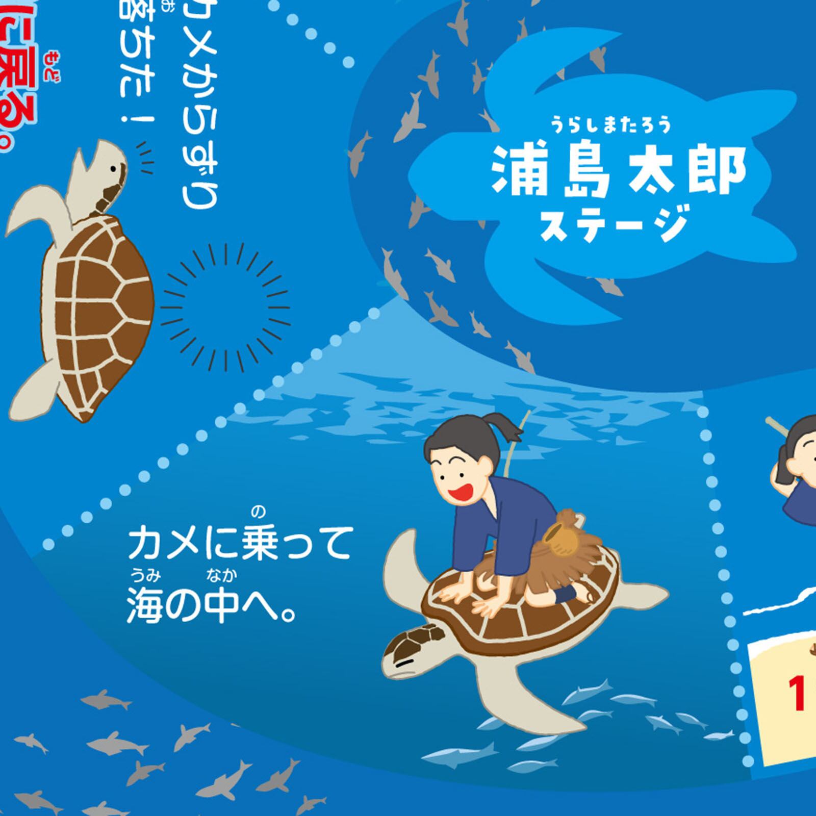 桃太郎、一寸法師、因幡の白兎、浦島太郎、一休さんの5つの昔話ステージを組み合わせて、家族や友達と一緒に楽しみながら夢の世界を探索しましょう!