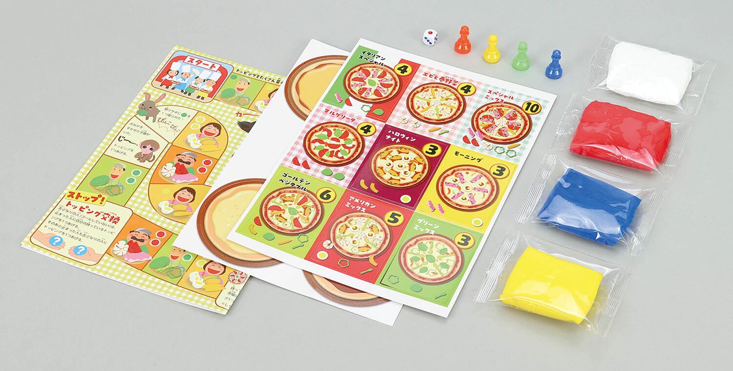 ピザの具材を集めながらゴールを目指そう!粘土の型抜き遊びとすごろくが一体化した新しいすごろくで、お子様の創造力を育むのにぴったりです。ピザのトッピングは粘土で作ります。作り方のガイドもついていますので、初めてでも安心して楽しむことができます
