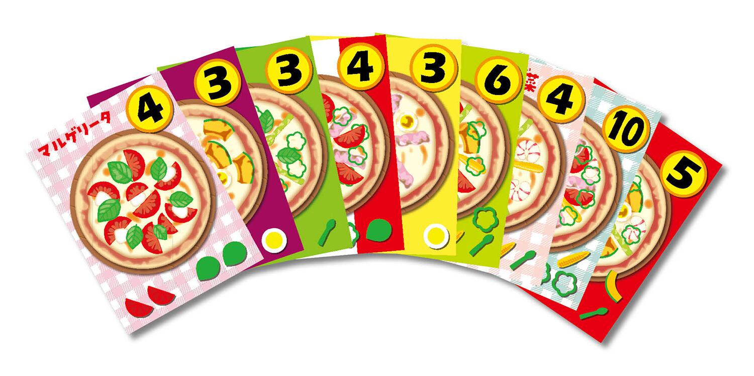 (すごろくシート×1、ピザ生地カード×5、レシピカード×9、コマ×4、サイコロ×1、AT粘土(赤・青・黄・白)×各1 )
