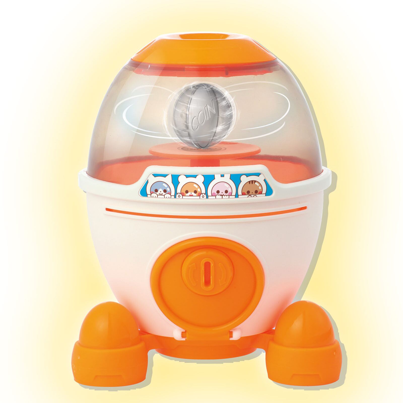 ロケットの形をしたかわいい貯金箱です!付属のシールを使って、あなただけのオリジナルデザインを楽しむことができます。コインを入れると、なんとくるくる回ります!お子様だけでなく、大人も楽しめるユニークな貯金箱です。